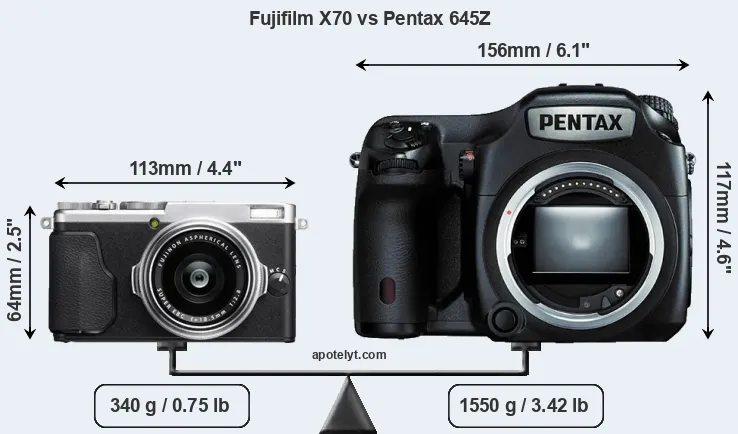 An illustration of the physical size and weight of the Fujifilm X70 and the Pentax 645Z is provided in the side-by-side display below. The two cameras are presented according to their relative size. Three consecutive perspectives from the front, the top, and the back are available. All width, height and depth dimensions are rounded to the nearest millimeter.