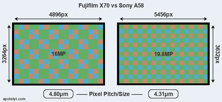 Despite having a slightly smaller sensor, the A58 offers a higher resolution of 19.8 megapixels, compared with 16 MP of the X70. This megapixels advantage comes at the cost of a higher pixel density and a smaller size of the individual pixel (with a pixel pitch of 4.31μm versus 4.80μm for the X70). Moreover, it should be noted that the X70 is much more recent (by 2 years and 10 months) than the A58, and its sensor will have benefitted from technological advances during this time that further enhance the light gathering capacity of its pixels. Coming back to sensor resolution, it should be mentioned that the X70 has no anti-alias filter installed, so that it can capture all the detail its sensor resolves.