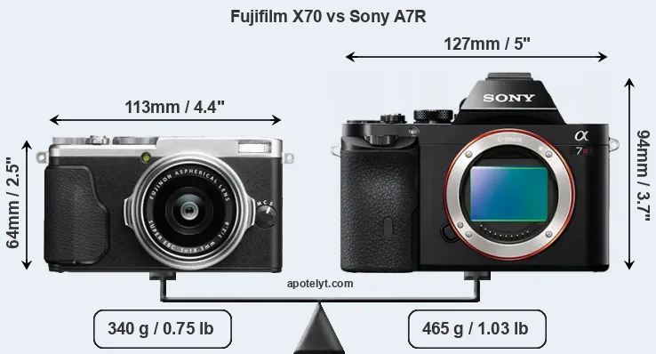 The physical size and weight of the Fujifilm X70 and the Sony A7R are illustrated in the side-by-side display below. The two cameras are presented according to their relative size. Three consecutive perspectives from the front, the top, and the back are available. All width, height and depth measures are rounded to the nearest millimeter.