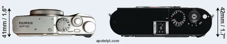 If the front view area (width x height) of the cameras is taken as an aggregate measure of their size, the Leica M Typ 240 is considerably larger (54 percent) than the Fujifilm XF10. It is noteworthy in this context that the M Typ 240 is splash and dust-proof, while the XF10 does not feature any corresponding weather-sealing.