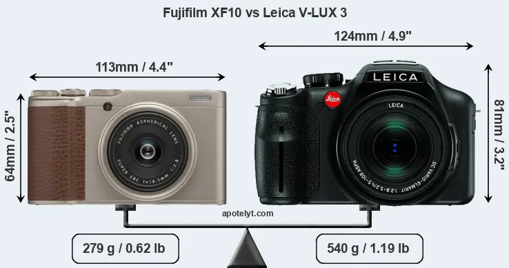 If the front view area (width x height) of the cameras is taken as an aggregate measure of their size, the Leica V-LUX 3 is notably larger (39 percent) than the Fujifilm XF10. Moreover, the V-LUX 3 is substantially heavier (94 percent) than the XF10. In this context, it is worth noting that neither the XF10 nor the V-LUX 3 are weather-sealed.