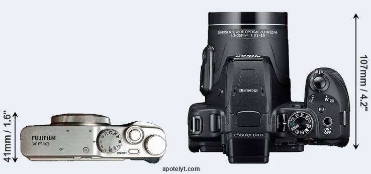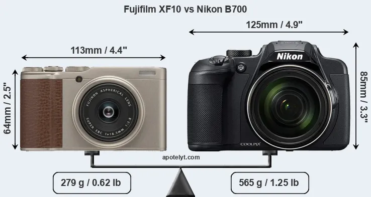 If the front view area (width x height) of the cameras is taken as an aggregate measure of their size, the Nikon B700 is considerably larger (47 percent) than the Fujifilm XF10. Moreover, the B700 is substantially heavier (103 percent) than the XF10. In this context, it is worth noting that neither the XF10 nor the B700 are weather-sealed.