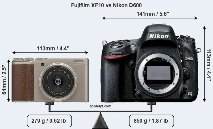 The physical size and weight of the Fujifilm XF10 and the Nikon D600 are illustrated in the side-by-side display below. The two cameras are presented according to their relative size. Three consecutive perspectives from the front, the top, and the back are available. All width, height and depth dimensions are rounded to the nearest millimeter.