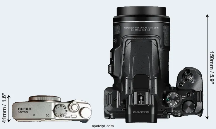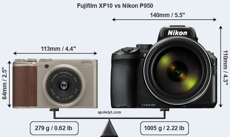 The physical size and weight of the Fujifilm XF10 and the Nikon P950 are illustrated in the side-by-side display below. The two cameras are presented according to their relative size. Three successive views from the front, the top, and the rear are shown. All width, height and depth measures are rounded to the nearest millimeter.