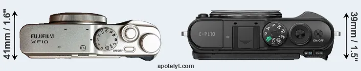 The above size and weight comparisons are to some extent incomplete and possibly misleading, as the XF10 has a lens built in, whereas the E-PL10 is an interchangeable lens camera that requires a separate lens. Attaching the latter will add extra weight and bulk to the setup. You can compare the optics available for the E-PL10 and their specifications in the Micro Four Thirds Lens Catalog.