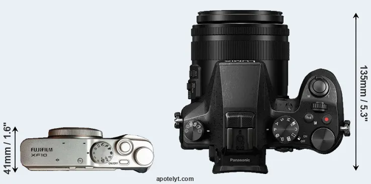 The physical size and weight of the Fujifilm XF10 and the Panasonic FZ2000 are illustrated in the side-by-side display below. The two cameras are presented according to their relative size. Three consecutive perspectives from the front, the top, and the back are available. All width, height and depth dimensions are rounded to the nearest millimeter.