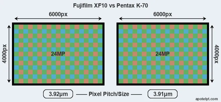 | Sensor Specs | Fujifilm XF10 | Pentax K-70 |