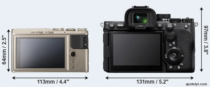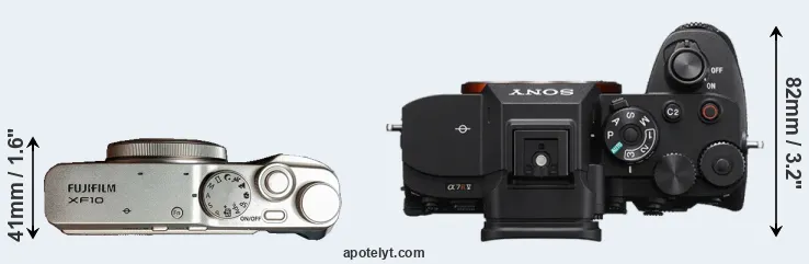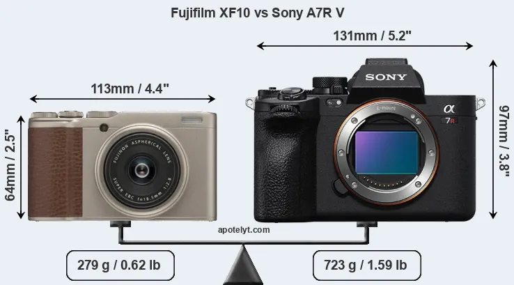 The physical size and weight of the Fujifilm XF10 and the Sony A7R V are illustrated in the side-by-side display below. The two cameras are presented according to their relative size. Three successive views from the front, the top, and the rear are shown. All width, height and depth dimensions are rounded to the nearest millimeter.
