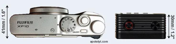 The side-by-side display below illustrates the physical size and weight of the Fujifilm XF10 and the Sony RX0. The two cameras are presented according to their relative size. Three consecutive perspectives from the front, the top, and the back are available. All width, height and depth dimensions are rounded to the nearest millimeter.
