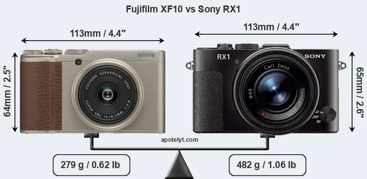 If the front view area (width x height) of the cameras is taken as an aggregate measure of their size, the Sony RX1 is somewhat larger (2 percent) than the Fujifilm XF10. Moreover, the RX1 is substantially heavier (73 percent) than the XF10. In this context, it is worth noting that neither the XF10 nor the RX1 are weather-sealed.