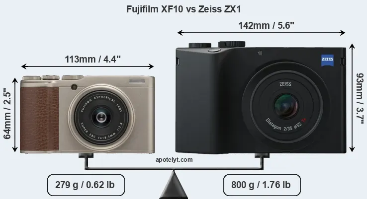 If the front view area (width x height) of the cameras is taken as an aggregate measure of their size, the Zeiss ZX1 is considerably larger (83 percent) than the Fujifilm XF10. Moreover, the ZX1 is substantially heavier (187 percent) than the XF10. In this context, it is worth noting that neither the XF10 nor the ZX1 are weather-sealed.