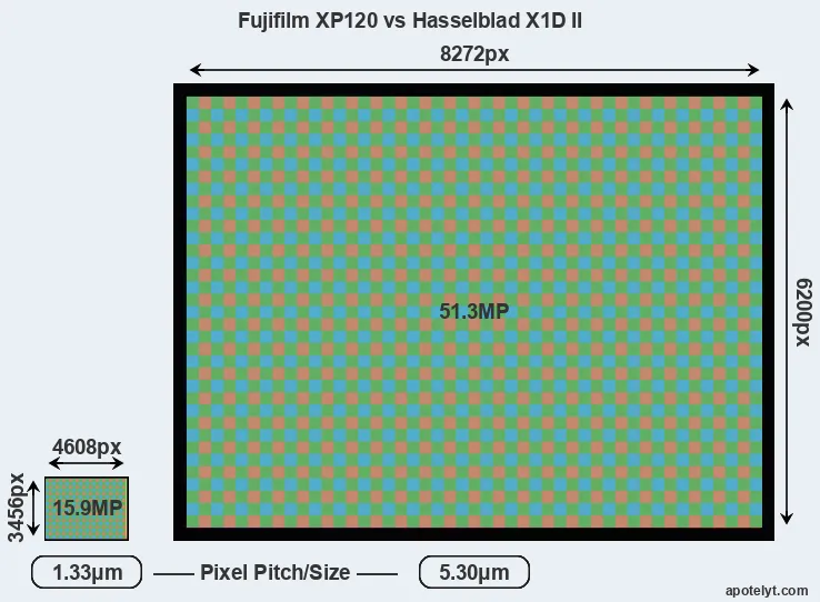 | Sensor Specs | Fujifilm XP120 | Hasselblad X1D II |