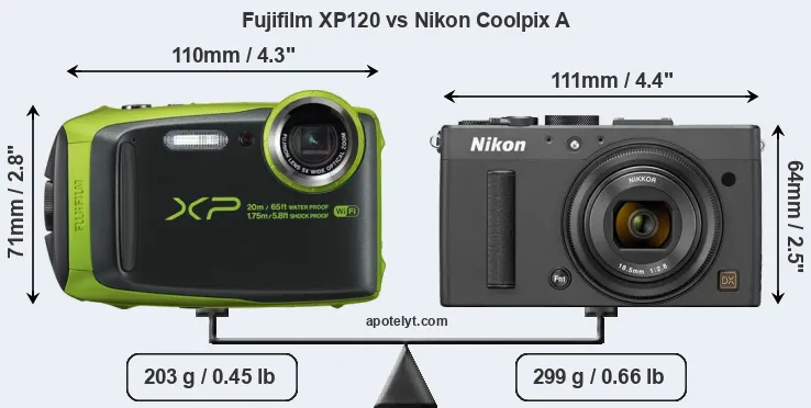 The physical size and weight of the Fujifilm XP120 and the Nikon Coolpix A are illustrated in the side-by-side display below. The two cameras are presented according to their relative size. Three consecutive perspectives from the front, the top, and the back are available. All width, height and depth dimensions are rounded to the nearest millimeter.