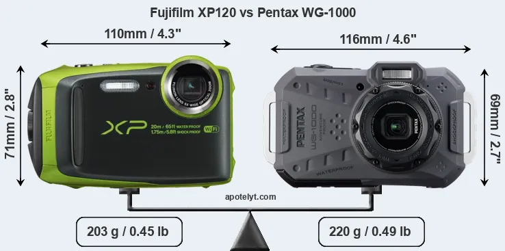 An illustration of the physical size and weight of the Fujifilm XP120 and the Pentax WG-1000 is provided in the side-by-side display below. The two cameras are presented according to their relative size. Three consecutive perspectives from the front, the top, and the back are available. All size dimensions are rounded to the nearest millimeter.