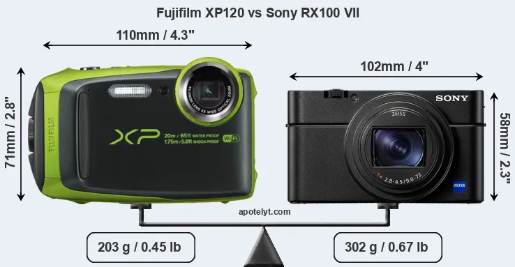 The physical size and weight of the Fujifilm XP120 and the Sony RX100 VII are illustrated in the side-by-side display below. The two cameras are presented according to their relative size. Three consecutive perspectives from the front, the top, and the back are available. All size dimensions are rounded to the nearest millimeter.