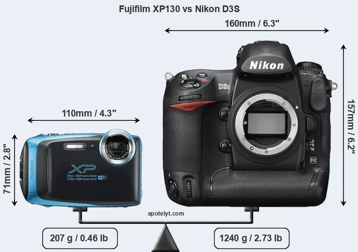 The physical size and weight of the Fujifilm XP130 and the Nikon D3S are illustrated in the side-by-side display below. The two cameras are presented according to their relative size. Three successive views from the front, the top, and the rear are shown. All width, height and depth dimensions are rounded to the nearest millimeter.