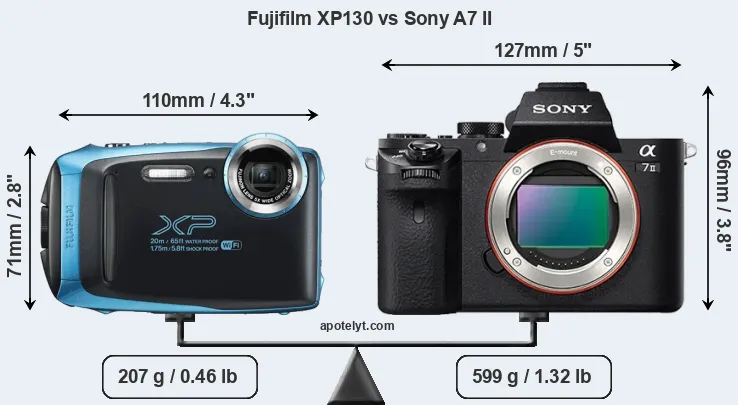 The physical size and weight of the Fujifilm XP130 and the Sony A7 II are illustrated in the side-by-side display below. The two cameras are presented according to their relative size. Three successive views from the front, the top, and the rear are shown. All size dimensions are rounded to the nearest millimeter.