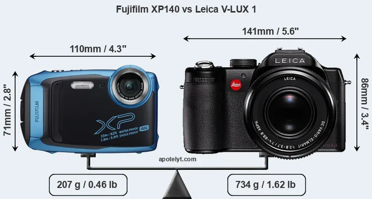 If the front view area (width x height) of the cameras is taken as an aggregate measure of their size, the Leica V-LUX 1 is considerably larger (55 percent) than the Fujifilm XP140. Moreover, the V-LUX 1 is substantially heavier (255 percent) than the XP140. It is worth mentioning in this context that the XP140 is splash and dust resistant, while the V-LUX 1 does not feature any corresponding weather-sealing. More than that, the XP140 is water-proof up to 25m and can, thus, be used for underwater photography.