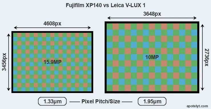Despite having a smaller sensor, the Fujifilm XP140 offers a higher resolution of 15.9 megapixels, compared with 10 MP of the Leica V-LUX 1. This megapixels advantage comes at the cost of a higher pixel density and a smaller size of the individual pixel (with a pixel pitch of 1.33μm versus 1.95μm for the V-LUX 1). However, it should be noted that the XP140 is much more recent (by 12 years and 5 months) than the V-LUX 1, and its sensor will have benefitted from technological advances during this time that make it possible to gather light more efficiently. Coming back to sensor resolution, it should be mentioned that neither of the two cameras has an anti-alias filter installed, so they are able to capture all the detail the sensor resolves.