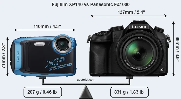 The physical size and weight of the Fujifilm XP140 and the Panasonic FZ1000 are illustrated in the side-by-side display below. The two cameras are presented according to their relative size. Three successive views from the front, the top, and the rear are shown. All size dimensions are rounded to the nearest millimeter.