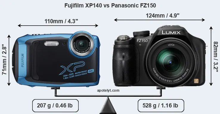 An illustration of the physical size and weight of the Fujifilm XP140 and the Panasonic FZ150 is provided in the side-by-side display below. The two cameras are presented according to their relative size. Three successive views from the front, the top, and the rear are shown. All width, height and depth dimensions are rounded to the nearest millimeter.
