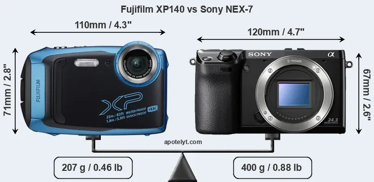 The side-by-side display below illustrates the physical size and weight of the Fujifilm XP140 and the Sony NEX-7. The two cameras are presented according to their relative size. Three successive views from the front, the top, and the rear are shown. All width, height and depth measures are rounded to the nearest millimeter.