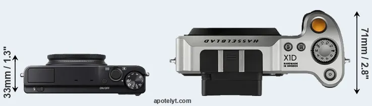 If the front view area (width x height) of the cameras is taken as an aggregate measure of their size, the Hasselblad X1D is considerably larger (149 percent) than the Fujifilm XQ1. It is noteworthy in this context that the X1D is splash and dust-proof, while the XQ1 does not feature any corresponding weather-sealing.