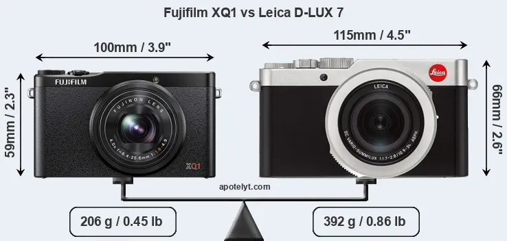 If the front view area (width x height) of the cameras is taken as an aggregate measure of their size, the Leica D-LUX 7 is notably larger (29 percent) than the Fujifilm XQ1. Moreover, the D-LUX 7 is substantially heavier (90 percent) than the XQ1. In this context, it is worth noting that neither the XQ1 nor the D-LUX 7 are weather-sealed.