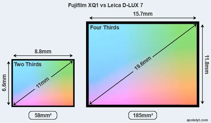 Of the two cameras under consideration, the Fujifilm XQ1 features a 2/3 sensor and the Leica D-LUX 7 a Four Thirds sensor. The sensor area in the D-LUX 7 is 219 percent bigger. As a result of these sensor size differences, the cameras have a format factor of, respectively, 3.9 and 2.2. Both cameras feature a native aspect ratio (sensor width to sensor height) of 4:3. The D-LUX 7 has the particularity of featuring a switch that allows to toggle between multiple aspect ratios, while maintaining the same field of view and full image resolution.