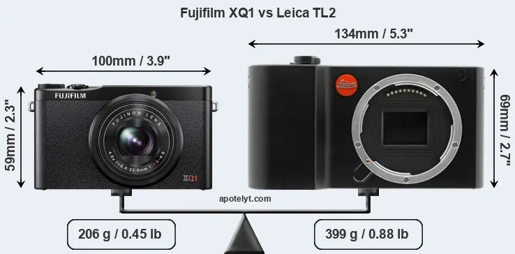 The side-by-side display below illustrates the physical size and weight of the Fujifilm XQ1 and the Leica TL2. The two cameras are presented according to their relative size. Three successive views from the front, the top, and the rear are shown. All size dimensions are rounded to the nearest millimeter.
