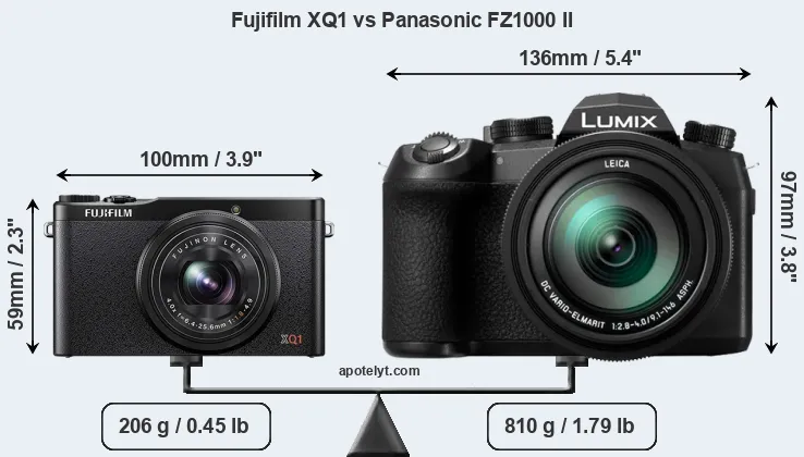 The physical size and weight of the Fujifilm XQ1 and the Panasonic FZ1000 II are illustrated in the side-by-side display below. The two cameras are presented according to their relative size. Three consecutive perspectives from the front, the top, and the back are available. All width, height and depth measures are rounded to the nearest millimeter.