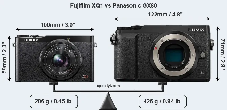 The side-by-side display below illustrates the physical size and weight of the Fujifilm XQ1 and the Panasonic GX80. The two cameras are presented according to their relative size. Three consecutive perspectives from the front, the top, and the back are available. All width, height and depth measures are rounded to the nearest millimeter.