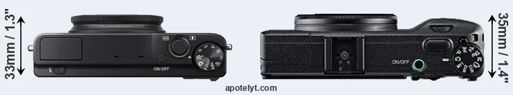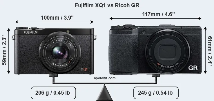 The side-by-side display below illustrates the physical size and weight of the Fujifilm XQ1 and the Ricoh GR. The two cameras are presented according to their relative size. Three consecutive perspectives from the front, the top, and the back are available. All width, height and depth dimensions are rounded to the nearest millimeter.