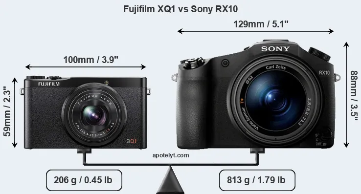 If the front view area (width x height) of the cameras is taken as an aggregate measure of their size, the Sony RX10 is considerably larger (92 percent) than the Fujifilm XQ1. Moreover, the RX10 is substantially heavier (295 percent) than the XQ1. It is noteworthy in this context that the RX10 is splash and dust-proof, while the XQ1 does not feature any corresponding weather-sealing.