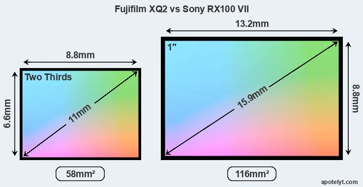 Of the two cameras under consideration, the Fujifilm XQ2 features a 2/3 sensor and the Sony RX100 VII an one-inch sensor. The sensor area in the RX100 VII is 100 percent bigger. As a result of these sensor size differences, the cameras have a format factor of, respectively, 3.9 and 2.7. The sensor in the XQ2 has a native 4:3 aspect ratio, while the one in the RX100 VII offers a 3:2 aspect.
