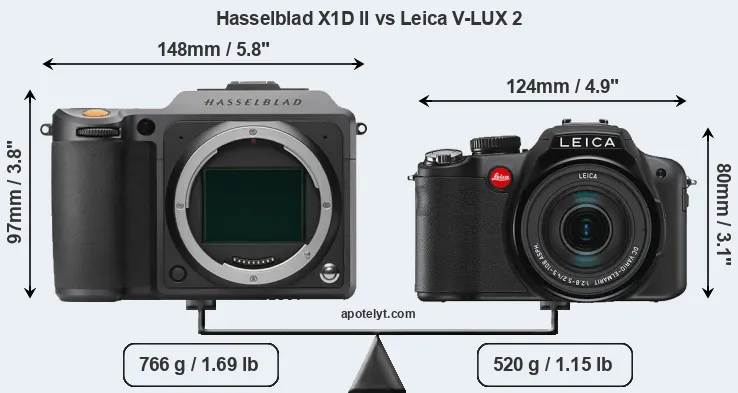 If the front view area (width x height) of the cameras is taken as an aggregate measure of their size, the Leica V-LUX 2 is considerably smaller (31 percent) than the Hasselblad X1D II. It is worth mentioning in this context that the X1D II is splash and dust resistant, while the V-LUX 2 does not feature any corresponding weather-sealing.