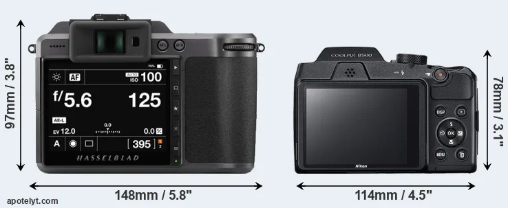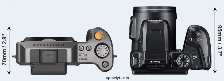 The physical size and weight of the Hasselblad X1D II and the Nikon B500 are illustrated in the side-by-side display below. The two cameras are presented according to their relative size. Three successive views from the front, the top, and the rear are shown. All width, height and depth measures are rounded to the nearest millimeter.