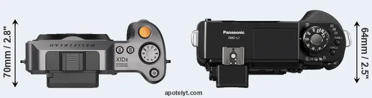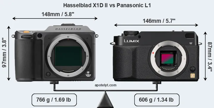The side-by-side display below illustrates the physical size and weight of the Hasselblad X1D II and the Panasonic L1. The two cameras are presented according to their relative size. Three consecutive perspectives from the front, the top, and the back are available. All width, height and depth measures are rounded to the nearest millimeter.
