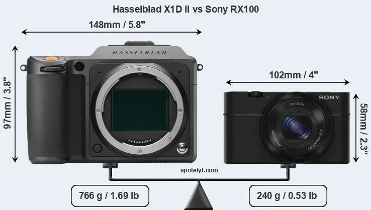 The physical size and weight of the Hasselblad X1D II and the Sony RX100 are illustrated in the side-by-side display below. The two cameras are presented according to their relative size. Three successive views from the front, the top, and the rear are shown. All width, height and depth measures are rounded to the nearest millimeter.