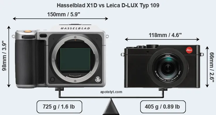 The side-by-side display below illustrates the physical size and weight of the Hasselblad X1D and the Leica D-LUX Typ 109. The two cameras are presented according to their relative size. Three successive views from the front, the top, and the rear are shown. All width, height and depth measures are rounded to the nearest millimeter.
