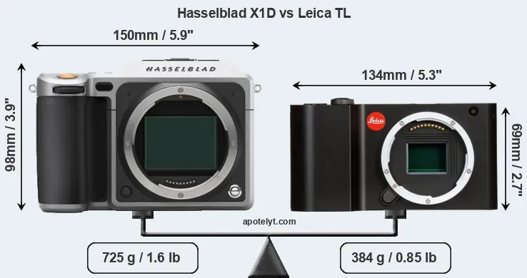 If the front view area (width x height) of the cameras is taken as an aggregate measure of their size, the Leica TL is considerably smaller (37 percent) than the Hasselblad X1D. Moreover, the TL is substantially lighter (47 percent) than the X1D. It is worth mentioning in this context that the X1D is splash and dust resistant, while the TL does not feature any corresponding weather-sealing.
