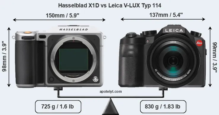 The physical size and weight of the Hasselblad X1D and the Leica V-LUX Typ 114 are illustrated in the side-by-side display below. The two cameras are presented according to their relative size. Three consecutive perspectives from the front, the top, and the back are available. All width, height and depth measures are rounded to the nearest millimeter.