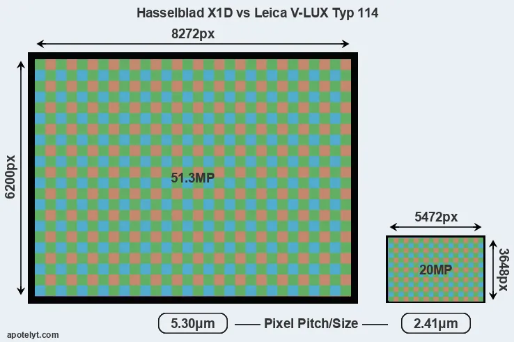 With 51.3MP, the X1D offers a higher resolution than the V-LUX Typ 114 (20MP), but the X1D nevertheless has larger individual pixels (pixel pitch of 5.30μm versus 2.41μm for the V-LUX Typ 114) due to its larger sensor. Moreover, the X1D is a somewhat more recent model (by 1 year and 9 months) than the V-LUX Typ 114, and its sensor might have benefitted from technological advances during this time that further enhance the light gathering capacity of its pixels. Coming back to sensor resolution, it should be mentioned that the X1D has no anti-alias filter installed, so that it can capture all the detail its sensor resolves.
