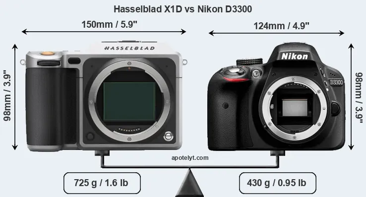 If the front view area (width x height) of the cameras is taken as an aggregate measure of their size, the Nikon D3300 is notably smaller (17 percent) than the Hasselblad X1D. Moreover, the D3300 is substantially lighter (41 percent) than the X1D. It is worth mentioning in this context that the X1D is splash and dust resistant, while the D3300 does not feature any corresponding weather-sealing.
