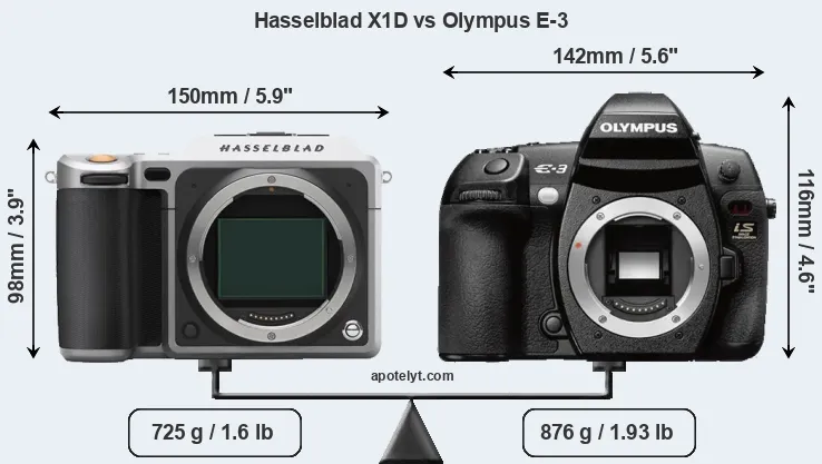 If the front view area (width x height) of the cameras is taken as an aggregate measure of their size, the Olympus E-3 is notably larger (12 percent) than the Hasselblad X1D. Moreover, the E-3 is markedly heavier (21 percent) than the X1D. In this context, it is worth noting that both cameras are splash and dust-proof and can, hence, be used in inclement weather conditions or harsh environments.
