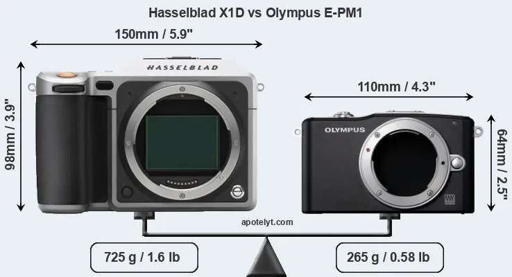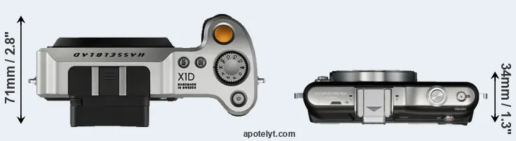 The side-by-side display below illustrates the physical size and weight of the Hasselblad X1D and the Olympus E-PM1. The two cameras are presented according to their relative size. Three consecutive perspectives from the front, the top, and the back are available. All width, height and depth measures are rounded to the nearest millimeter.