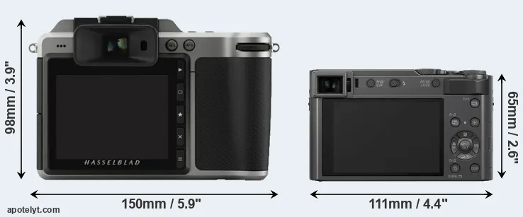 The side-by-side display below illustrates the physical size and weight of the Hasselblad X1D and the Panasonic TZ200. The two cameras are presented according to their relative size. Three successive views from the front, the top, and the rear are shown. All size dimensions are rounded to the nearest millimeter.