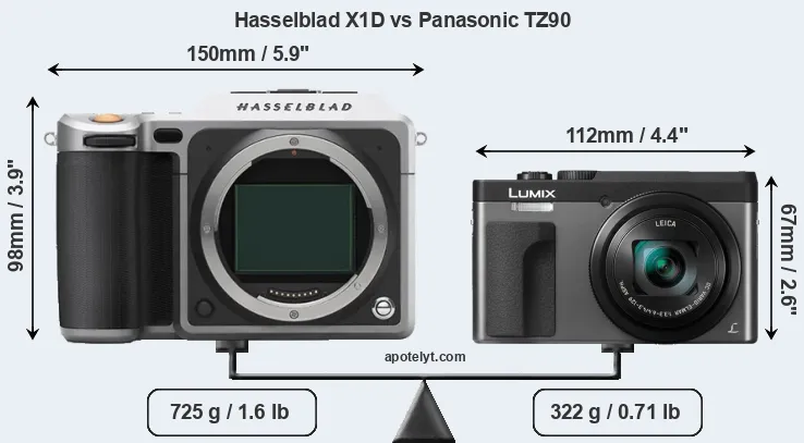 An illustration of the physical size and weight of the Hasselblad X1D and the Panasonic TZ90 is provided in the side-by-side display below. The two cameras are presented according to their relative size. Three successive views from the front, the top, and the rear are shown. All width, height and depth measures are rounded to the nearest millimeter.