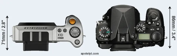 The side-by-side display below illustrates the physical size and weight of the Hasselblad X1D and the Pentax K-1. The two cameras are presented according to their relative size. Three consecutive perspectives from the front, the top, and the back are available. All width, height and depth measures are rounded to the nearest millimeter.