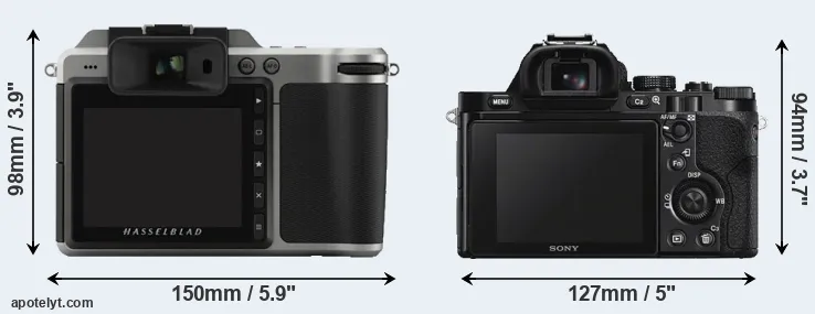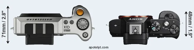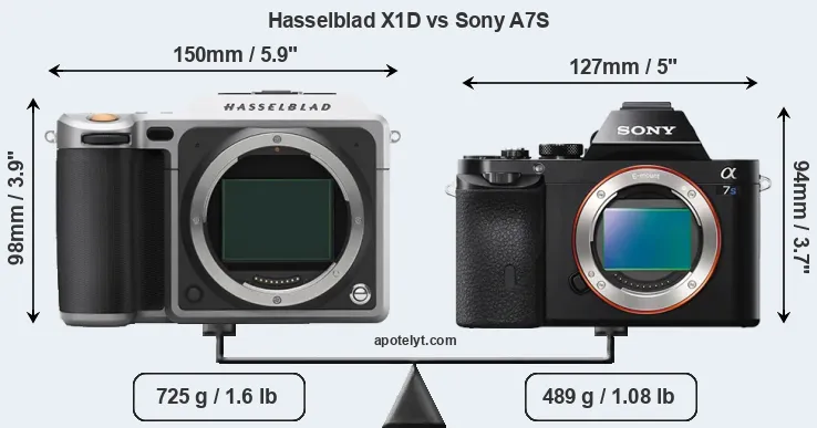 The side-by-side display below illustrates the physical size and weight of the Hasselblad X1D and the Sony A7S. The two cameras are presented according to their relative size. Three consecutive views from the front, the top, and the rear side are shown. All width, height and depth dimensions are rounded to the nearest millimeter.